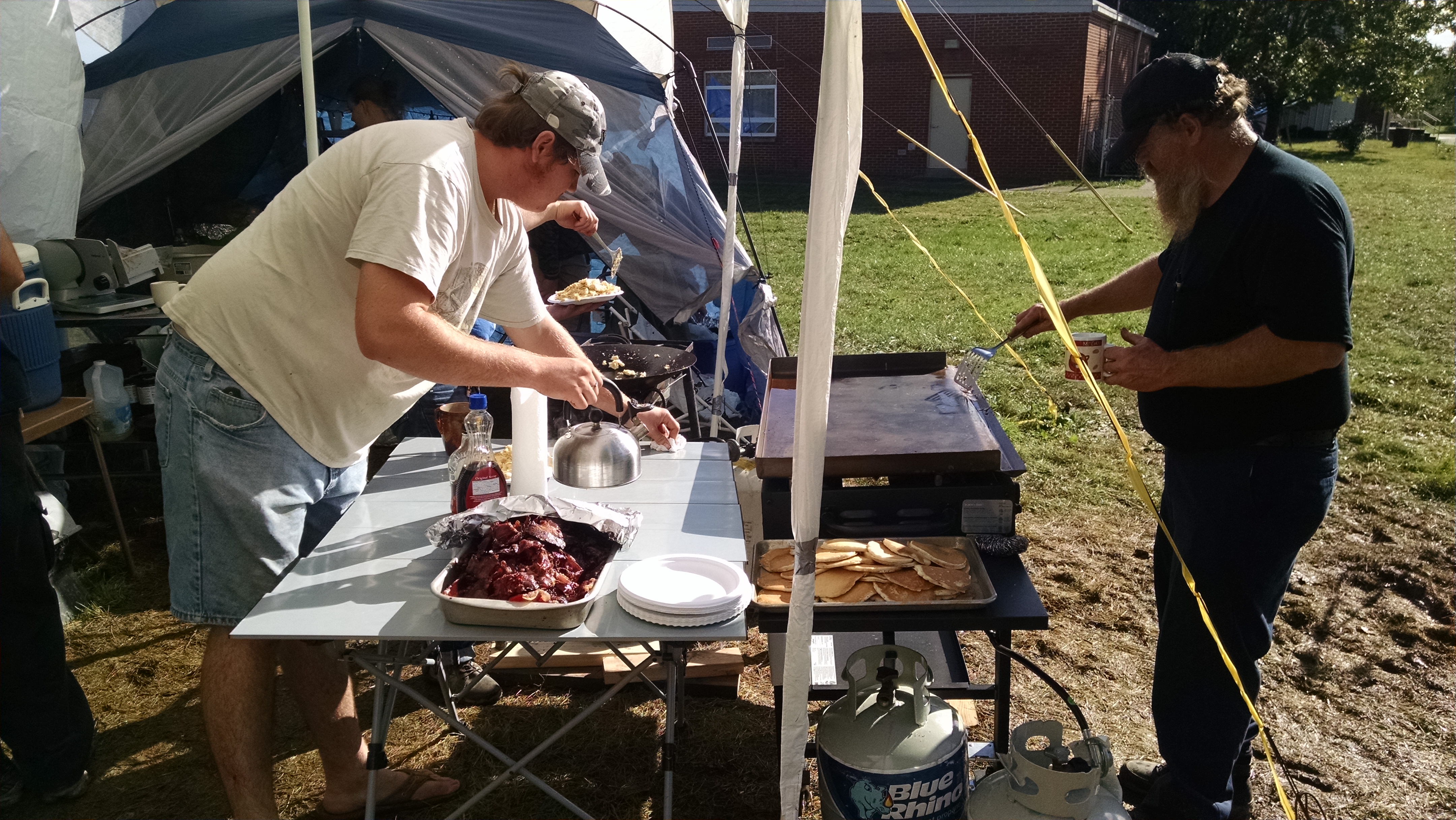 On the end of the large shelter is a tent dedicated solely as the ‘pantry,’ stocked with shelves of food and cooking utensils. In front were multiple cook tops for every conceivable need, tables and a dozen chairs. Among the pots and pans was a neat giant wok that they made fried rice in… the wok was made from a plugged plow disc with welded handles from a horseshoe. Very nice, country and pragmatic… Just my kind of stuff. Wish I had taken a pic so you could see it. (I saw enough to make one…)