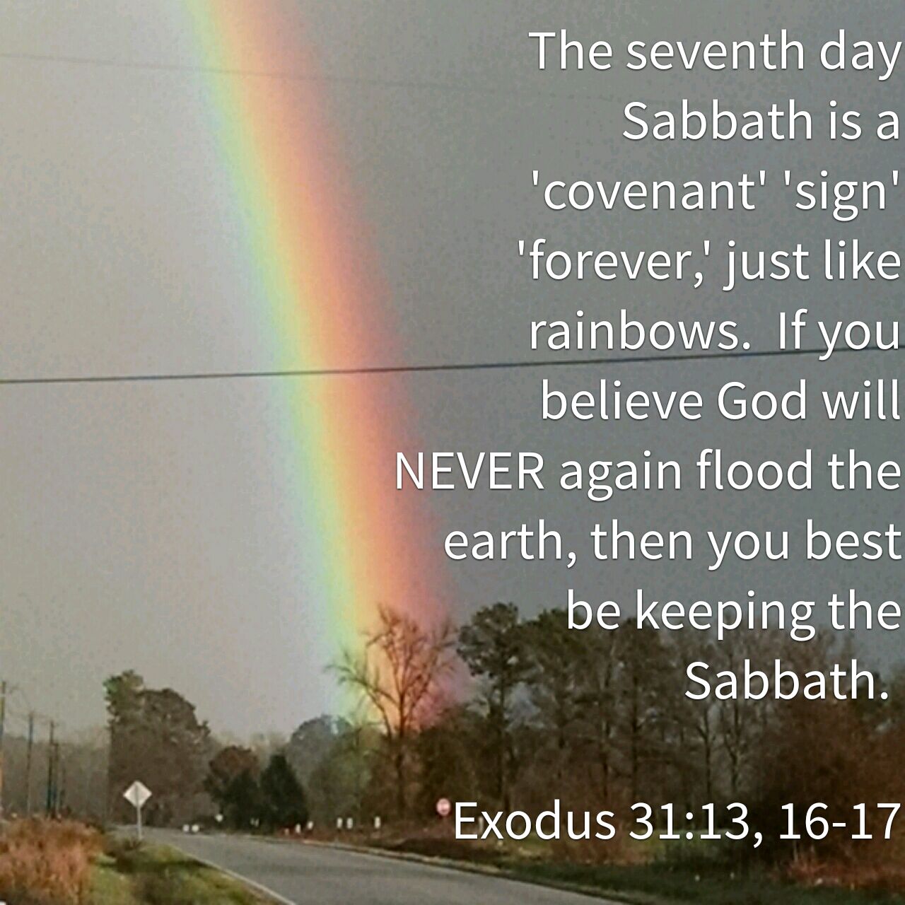 I cannot look at a rainbow, though, without remembering the Sabbath. God uses EXACTLY the same terminology when He gives the Covenant of the Sabbath as He does with the Covenant of the Rainbow.