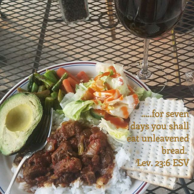 Curried lamb, lemon sauteed asparagus, spiced carrots, salad, avocado and wonderful matzah along with a glass of Josh.
